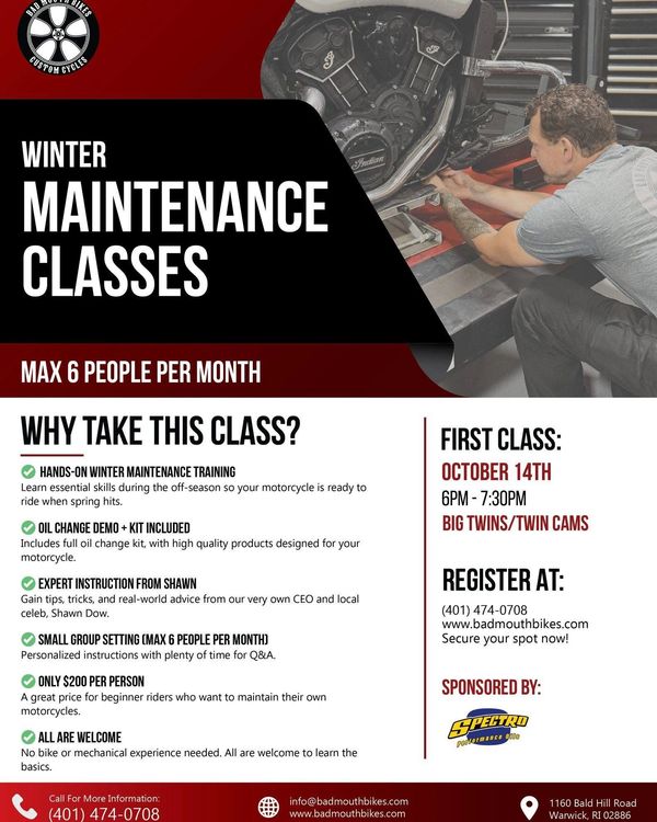 Bad Mouth Bikes is teaming up with Spectro to offer hands-on training classes throughout the winter. Each session will be led by our CEO Shawn Dow and held in a small group setting, with only 6 slots available per month to ensure personalized instruction. The class will feature a live oil change demonstration, and each participant will receive a full oil change kit. No prior experience is required, just come ready to learn. The cost is $200 per person.
